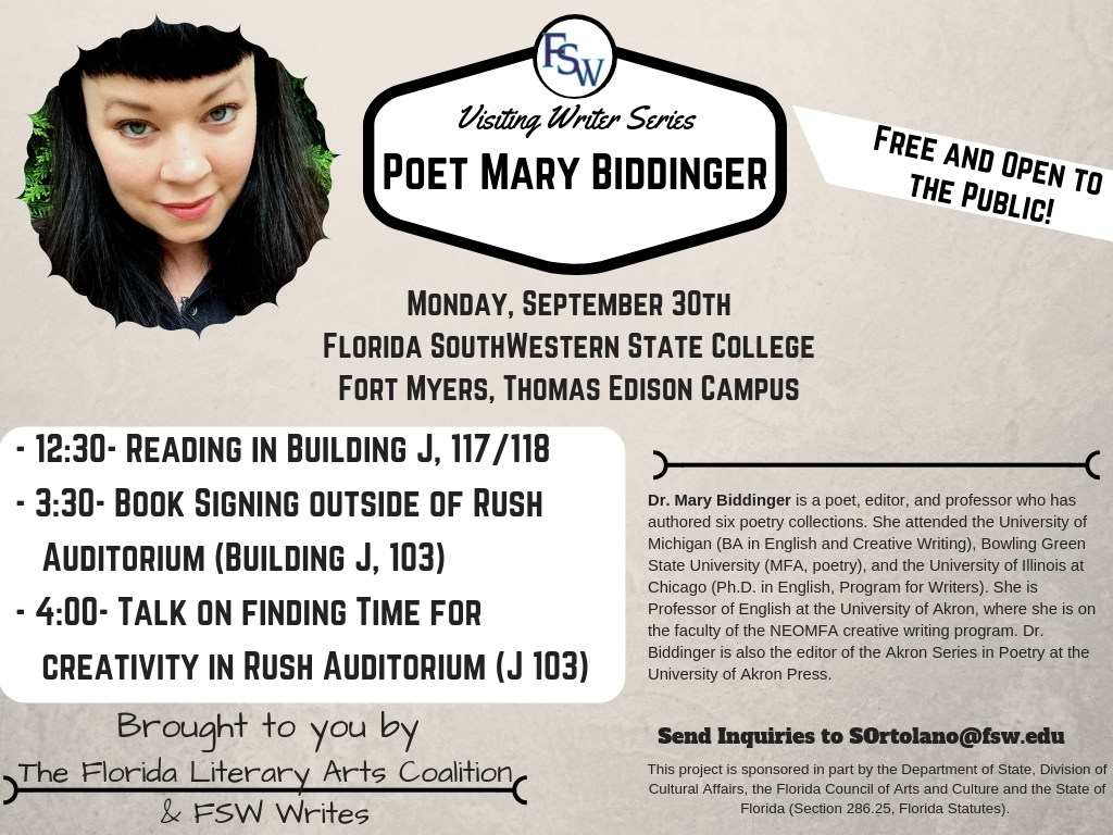 Tomorrow is the beginning of a three-college tour in Florida–my first of two tours this academic year. You can find information on this week’s activities below, and a full listing of upcoming readings here. Yay!